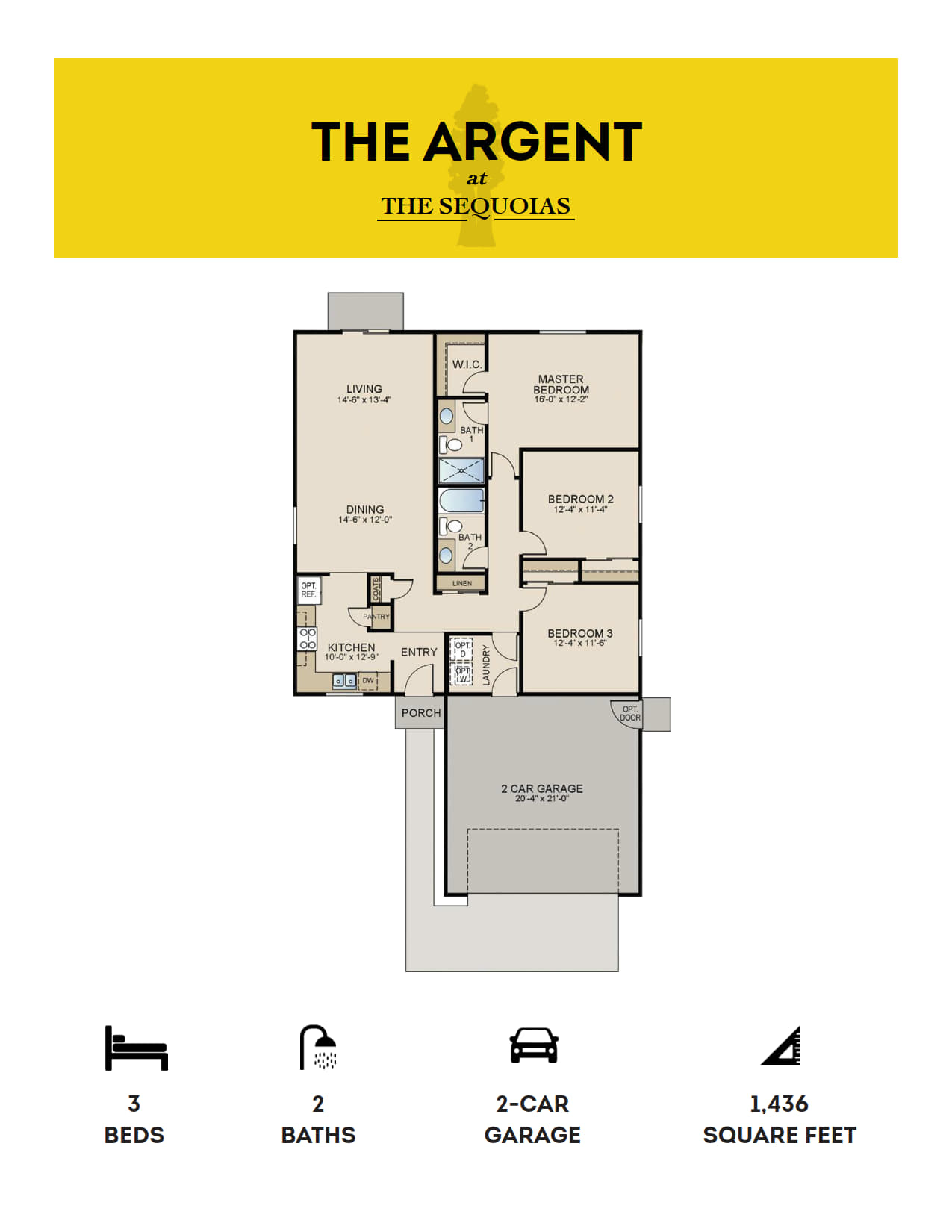 The Argent(1436 sq. ft.) is a 1-story home with 3 bedrooms, 2 bathrooms and 2-car garage. Features include dining room, guest room and living room.